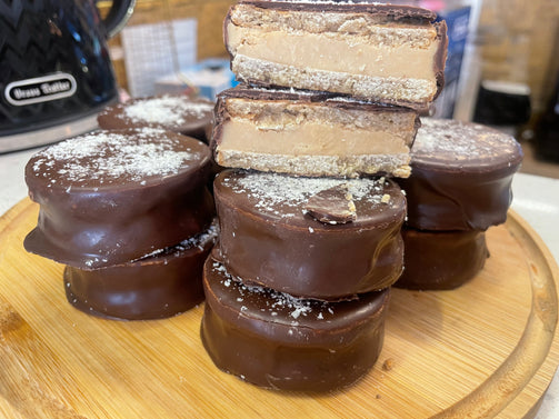 Tapitas de harina de avena y harina de almendras relleno de mantequilla de maní y chocolate blanco sin azúcar. Endulzamos con alulosa. Exceptuando el chocolate blanco que ya viene endulzado con isomaltosa.