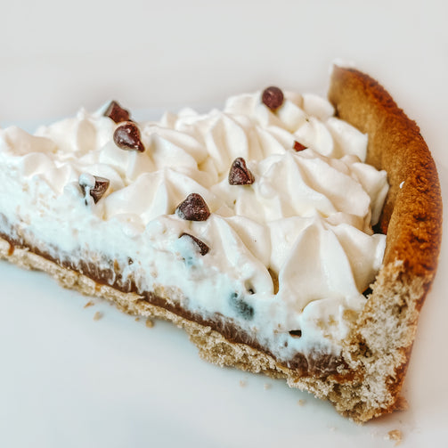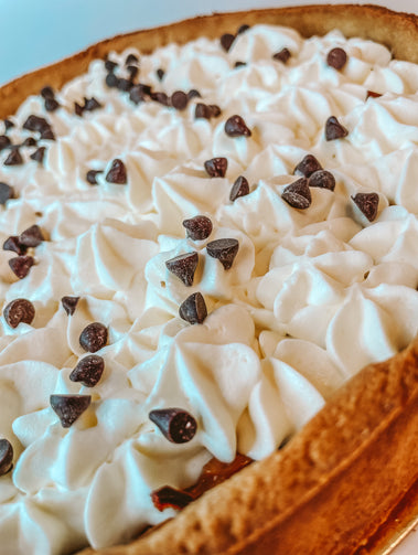 Base de harina de avena y harina integral de trigo, relleno con manjar sin azúcar, plátano y crema batida.