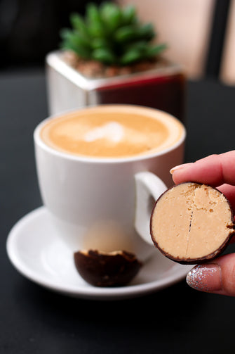 De mantequilla de maní, chocolate blanco sin azúcar, bañado en chocolate sin azúcar.