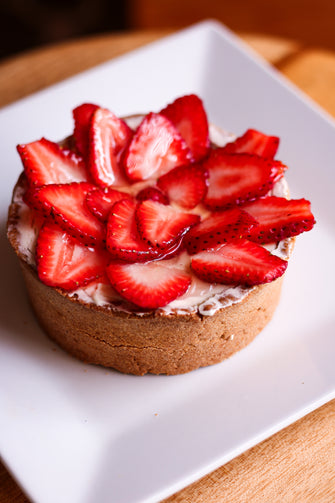 Base de harina de avena, relleno de crema pastelera baja en grasas, crema de leche batida, compota de frutilla y frutilla y durazno.