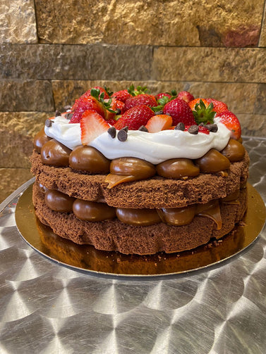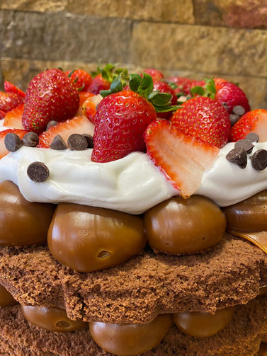 Bizcocho de avena y cacao, rellena con manjar, crema, decoración superior de manjar, crema, frutillas y algunos chocolates.