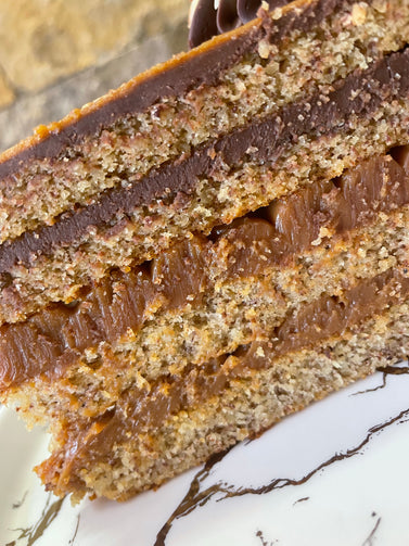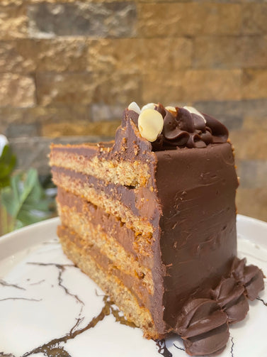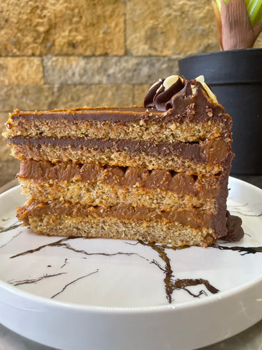 Bizcocho de harina de Almendras, relleno con manjar sin azúcar y GANACHE de chocolate 56% cacao.